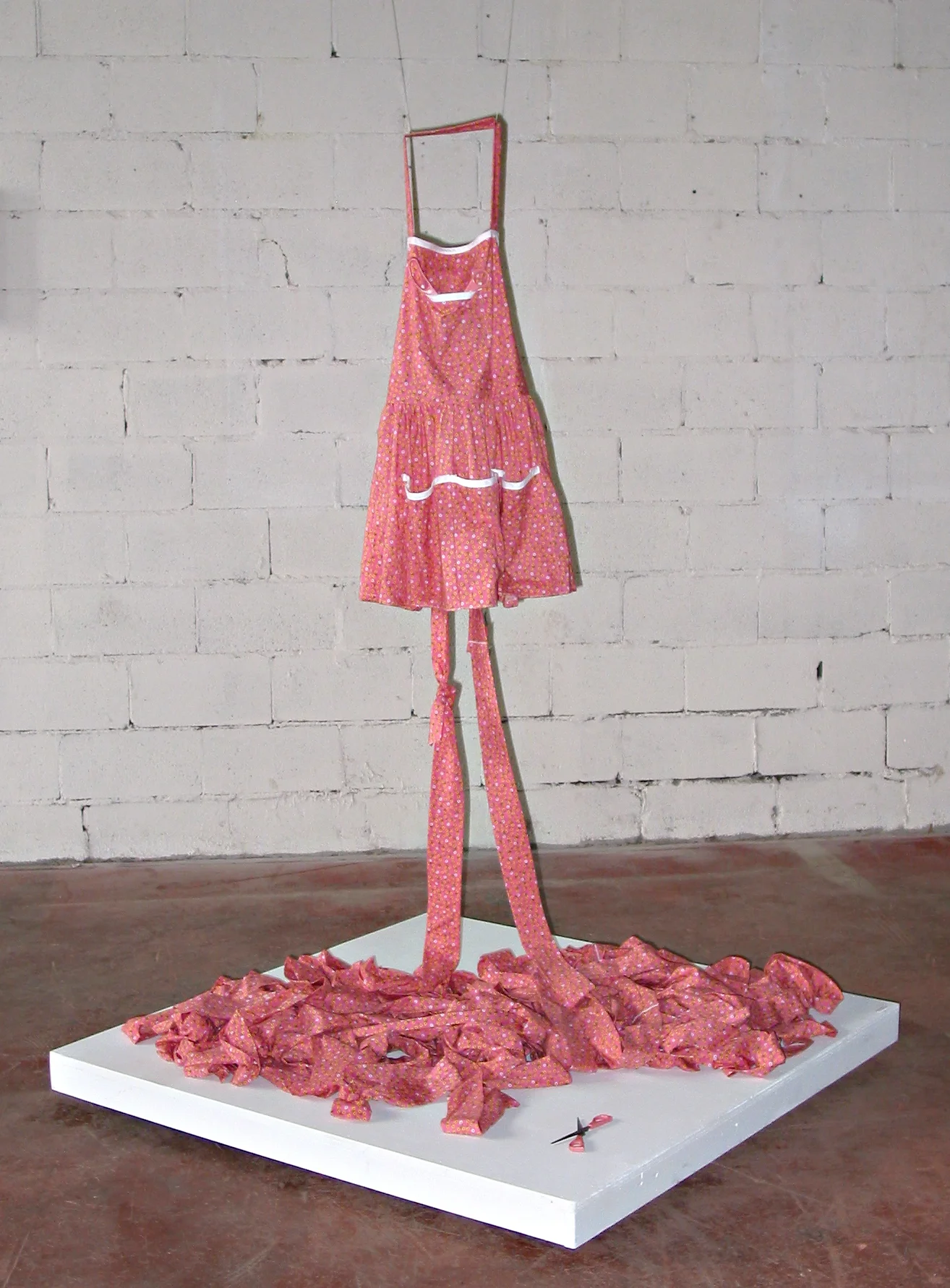 The most recent work included in pink stems from my experience of regularly being addressed as “Sir” since moving to the South. I have always been a tall woman with short hair, a relatively low voice, and a confident presence. This constant questioning of my femininity leads me to explore the standards of femaleness and the gendered indoctrination systems in place during my childhood. My mother was a product of the fifties. Her mother trained her well. I see the ideals of the fifties feminine identity as an alter ego of sorts to my own feminist existence. Something went awry during my training. Where did she go wrong?